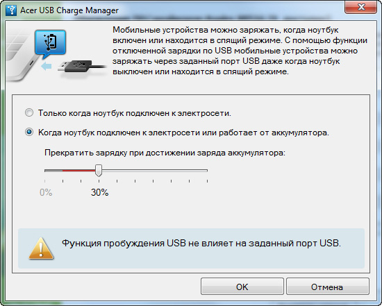 Acer USB Charge Manager - также полезная утилита регулировки зарядки устройств от USB дескноута.