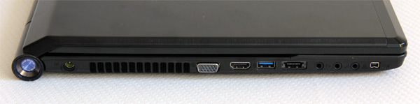 Левый торец - адаптер питания, воздуховодная решетка, VGA, HDMI, USB 3.0, eSATA/USB, вход антенны Wi-Fi, микрофон, наушники, FireWire/i.LINK.