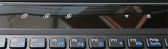 Над клавиатурой находится черная глянцевая панель. При включении ноутбука там появляются индикаторы и сенсорные кнопки.