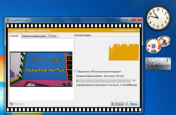 Перегон DVD в DivX через CloneDVDMobile - загрузка процессора 15 процентов.