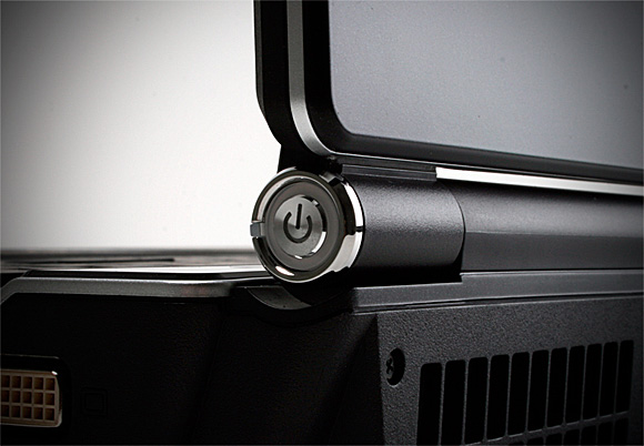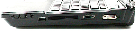 Правый торец - наушники, микрофон, вход для антенны Wi-Fi и неизвестный науке вход. Далее - USB, слот плат расширений, eSATA и DVI. Кстати, DVI на ноутбуках попадается редко, все больше VGA. На поворотном крепеже крышки - светящаяся кнопка питания, которая один в один сперта у Sony Vaio.