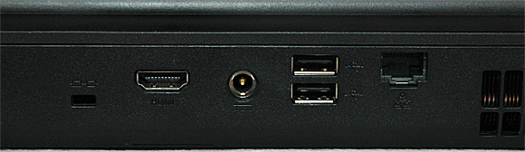 Задний торец: защитный порт, HDMI, адаптер питания, два USB и сеть.