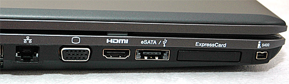 На левом торце - Ethernet, VGA, HDMI, eSATA (он же USB 2.0), ExpressCard, FireWire.
