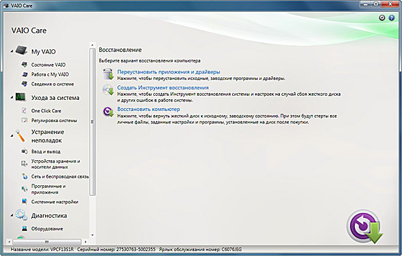 Следующее приложение - VAIO Care. Набор системных утилит - диагностика, справка, информация о системе, восстановление драйверов и всей системы. Разговаривает с пользователем с легким чукотским акцентом, потому что один из пунктов меню называется "Ухода за система".