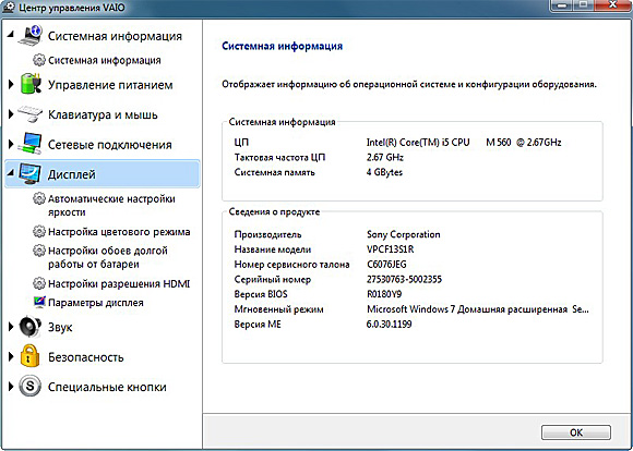 Еще одна полезная утилитка - "Центр управления VAIO". Там в удобной форме можно настраивать самые разнообразные параметры.