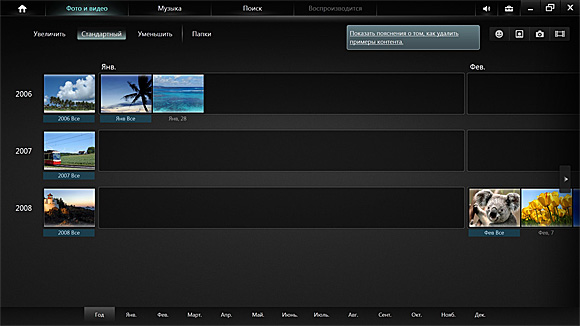 Фото и видео могут быть представлены в разных видах - по годам, по папкам, большими окнами предпросмотра.