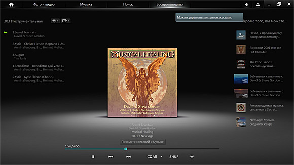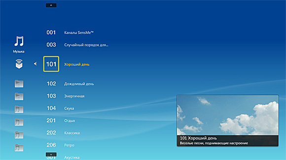 Музыку можно раскладывать по исполнителям, альбомам, жанрам, также выводит каналы SensMe.
