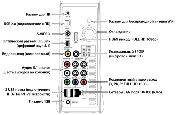 С выходами у HD370W даже побогаче, чем у TViX: кроме кучи всего, что может пригодиться (S-Video, Digital Sound оптический и коаксиал, HDMI, композит), еще и аналоговый 5.1 с декодированием Dolby и DTS, то есть устройство может выводить пятиканальный звук без отдельного декодера или ресивера. При этом поддерживается downmix - то есть 5.1 при необходимости может преобразовываться устройством в стерео.
