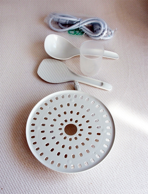 Аксессуары. Провод питания, половник, ложка с подставкой для крепления на корпус мультиварки, мерный стакан на 160 мл, стимер (подставка для продуктов, под которую наливается вода).