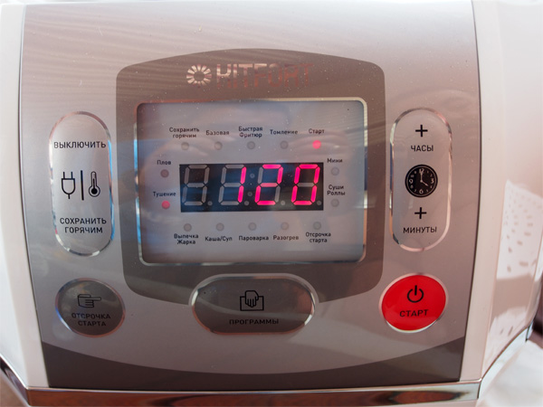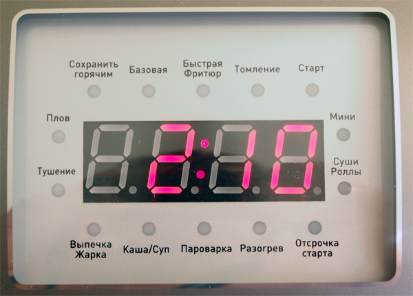 Тут все, в общем, довольно просто. Кнопки: выключить/сохранить горячим, задание программы готовки, задание отсрочки старта, установка часов/минут и кнопка "Старт".