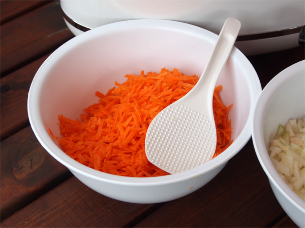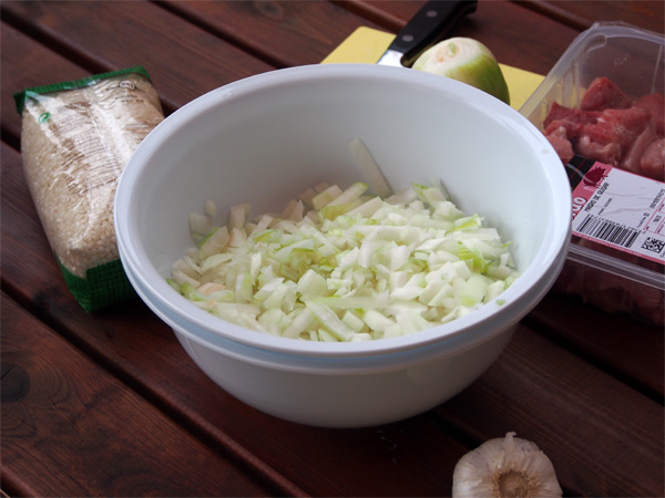 Итак.  Берем три луковицы, четыре морковки, полкило свинины с жирком и пачку круглого риса.