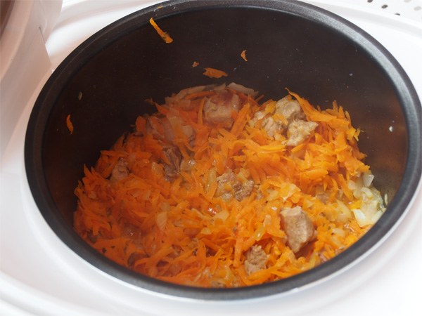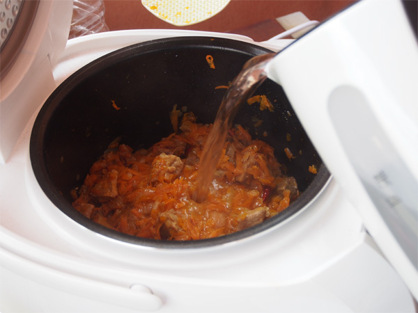 После заливки воды и засыпки специй мясо с луком и морковью ставим в режим тушения.