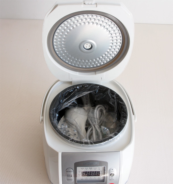 В общем случае мультиварка представляет собой несложное и не особенно дорогое устройство (бюджетные модели стоят $100-200). Это нечто вроде кастрюли с крышкой, снабженной микропроцессором, дисплеем, кнопками управления и чашей с антипригарным покрытием, в которую помещаются продукты для готовки.