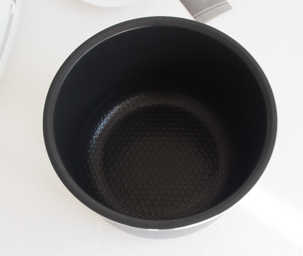 Внутри - чаша для готовки вместительностью 5 литров с антипригарным покрытием. (Как пишет производитель, антипригарное покрытие - нового типа. Но что за тип и в чем его модерновость - не уточняет.)