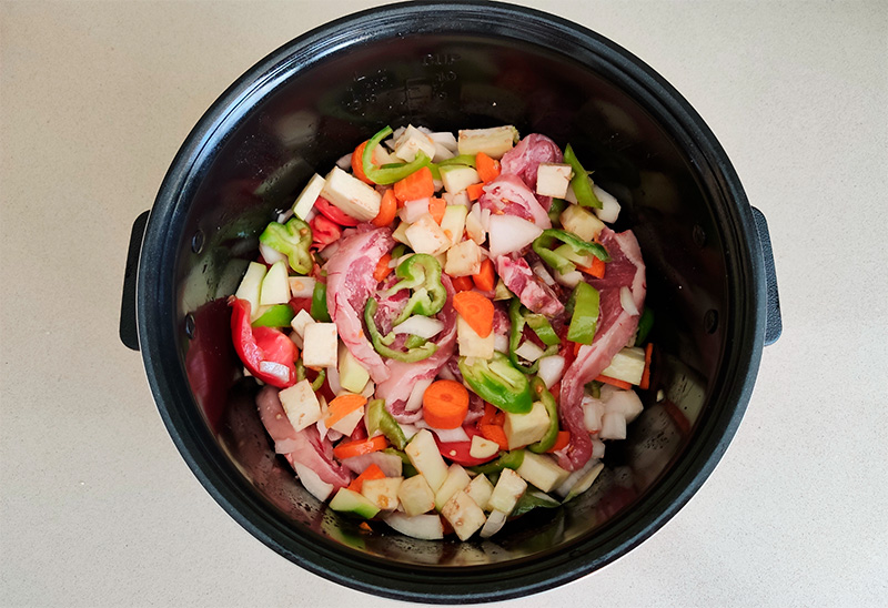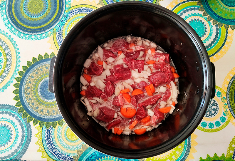 Лук и морковка нарезаются, вместе с кусками говядины высыпаются в чашу. Туда же добавляется немного воды.