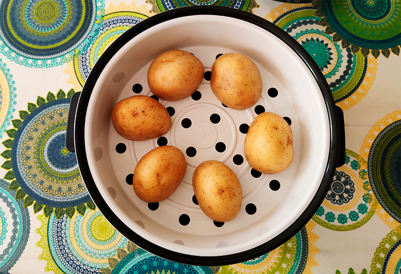 Картофель, разрезанный пополам, кладем в соответствующий контейнер и помещаем его в чашу.