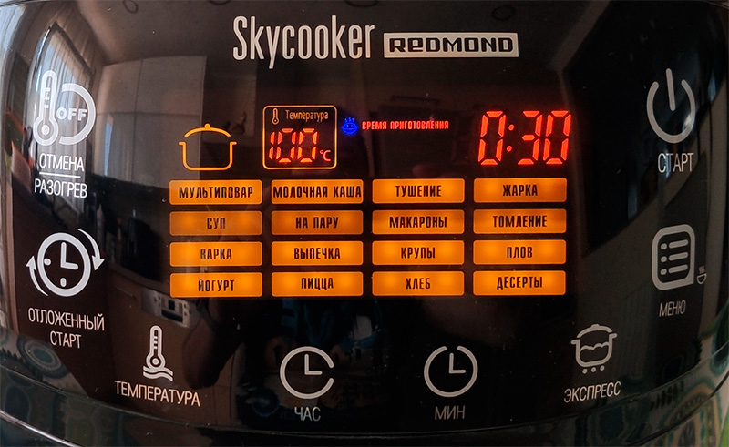 Управляется мультиварка с помощью сенсорных клавиш: кнопка меню включает дисплей, при последующих нажатиях меняет программы. Клавишами можно подкорректировать время и температуру приготовления, задать отложенный старт и отменить разогрев.