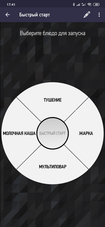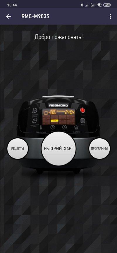 Основное меню приложения: рецепты, быстрый старт и программы.