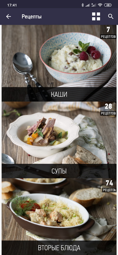 Интереснее всего - рецепты. Они подразделяются на каши, супы, вторые блюда, гарниры, салаты, выпечку, су-вид и так далее.