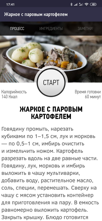 Подготовили продукты, поместили в контейнер, нажали на кнопку "Старт" прямо из рецепта (там тоже можно подкорректировать параметры и задать отложенный старт) - и мультиварка начинает готовку.