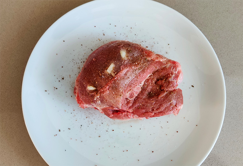 Решил приготовить свиные щечки. Для них рецепта не было, но я решил, что подойдет рецепт приготовления свиной рульки. Нашпиговал чесночком, посолил, поперчил.