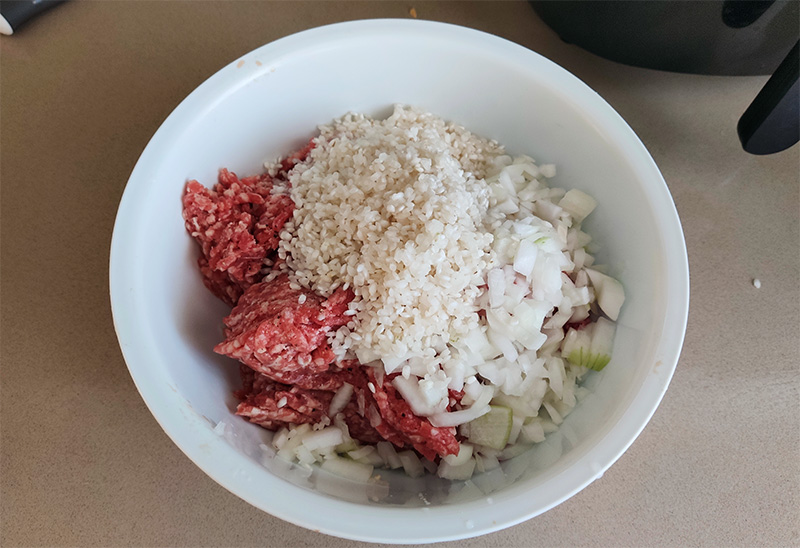 Мясной фарш (я беру говяжий), мелко порезанный лук (ну, насколько у меня получается его вообще мелко порезать), горсть хорошо промытого риса. Все это перемешать, посолить, поперчить.