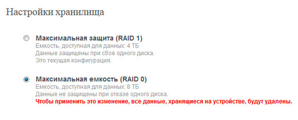 Далее потребуется ответить на вопрос, какой тип хранилища вы предпочитаете: максимально надежный (два диска дублируются - RAID 1) или максимально емкий (RAID 0).