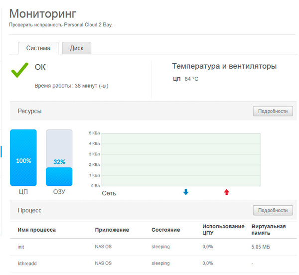 Мониторинг системы. Обратите внимание, что температура процессора - аж 84 градуса.