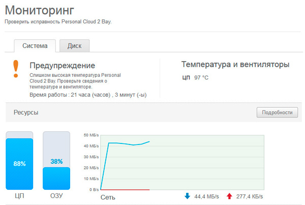 Мои опасения оправдались: действительно, под нагрузкой диски накопителя и сам накопитель ощутимо нагреваются - примерно через час после запуска копирования большого количества файлов накопитель выдал предупреждение о том, что температурный датчик одного из дисков зафиксировал превышение безопасного порога, а процессор при этом нагрелся почти до 100 градусов.