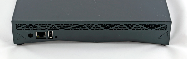 На заднем торце: кнопка питания, вход адаптера питания, порт Ethernet, вход USB 2.0 и кнопка Reset.