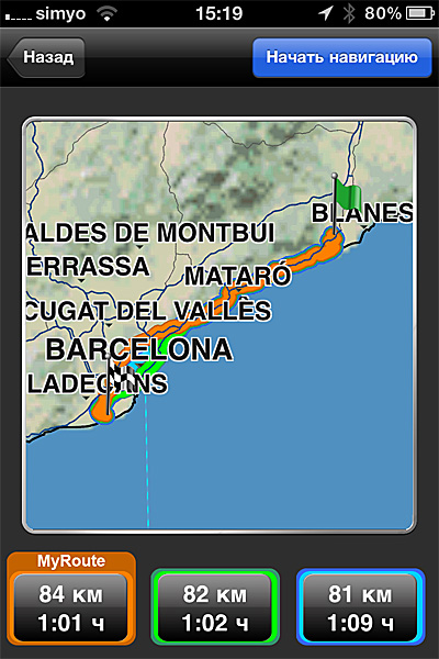 После всех этих разочарований в iGo и Sygic Aura приобрел Navigon Europe. Покатался. Остался доволен. Во-первых, он умеет сразу давать на выбор три варианта маршрута, что нередко бывает очень даже актуально.