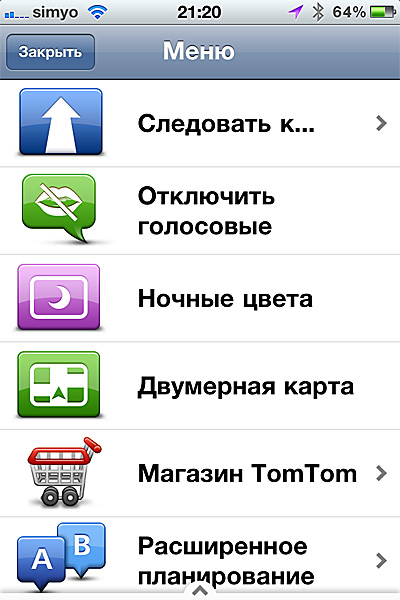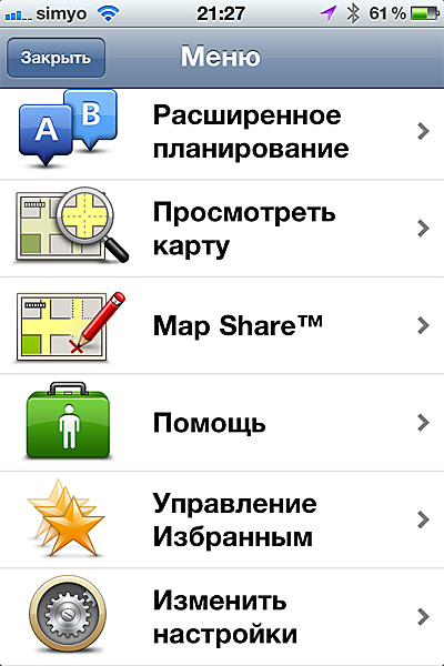 На второе - TomTom (Москва и область, основные магистрали) версии 1.4.1. ТомТом мне нравился еще со времен Палма, потому что ВСЕГДА строил лучшие маршруты. Для айфона он оказался верен старым традициям - по Мск водил безупречно, но за пределами МО - знает лишь основные магистрали, в областных городах - не пробовал. До Брянской области довел без проблем и вылетов.