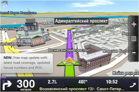 Что характерно, об этом ни разу не пожалел. Действительно, совершенно новый интерфейс, дома и трехмерные строения для крупных городов, приличная навигация, неплохая информативность. И мне эта версия настолько понравилась, что по Москве и Питеру я даже чаще предпочитаю ее "Навителу". И только при езде по России и мелким городам альтернативы "Навителу" нет - просто с точки зрения подробности карт.