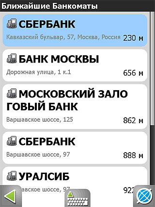 Также очень порадовала функция поиска нужных объектов поблизости. Например, заехали вы черт знает куда и вдруг выяснили, что вам срочно нужен банкомат - подоить карточку. Щелкаете "Поиск" - "Ближайшие" и выбираете там банкоматы. Вам тут же выдается список банкоматов поблизости, причем на нужный банкомат можно щелкнуть - и программа проложит туда маршрут.