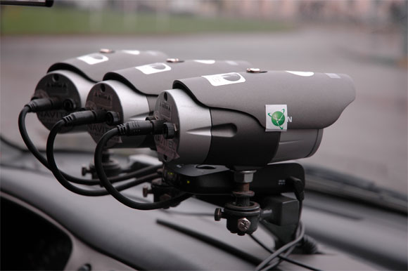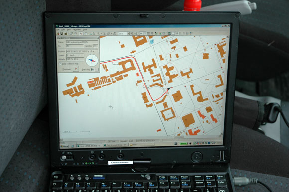 Затем автомобиль с бригадой (водитель и, так сказать, штурман) выезжает на место. Там ловится устойчивый сигнал GPS, после чего начинается движение, во время которого четыре камеры непрерывно фиксируют все вокруг, а штурман заносит информацию в ноутбук.