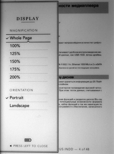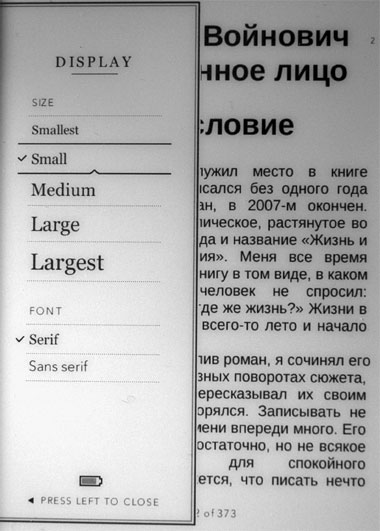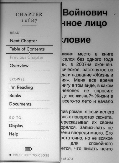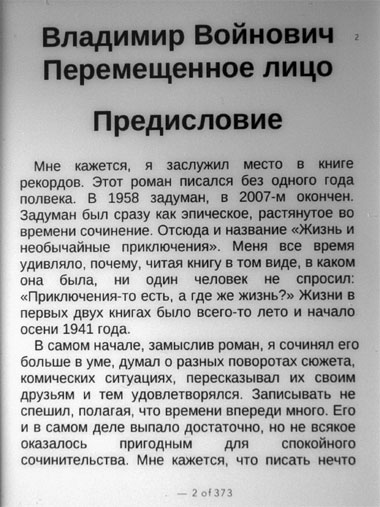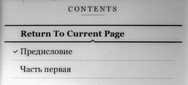 На этом весь сервис при чтении и заканчивается. Бедненько, конечно. Но чисто. Больше всего не хватает возможности перехода на заданную страницу: ридер не умеет ускоренно листать страницы при длинном нажатии кнопки перелистывания, так что если вам захочется начать читать только что залитую в ридер книгу, например, с пятисотой страницы, то я вам сильно не завидую. Разве что оглавление тут хоть как-то поможет, если оно присутствует и достаточно подробное.