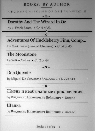 Сверху над списком книг выводится алфавитный указатель, с помощью которого можно отбирать книги по названиям и по авторам. Впрочем, для кириллицы это не актуально.