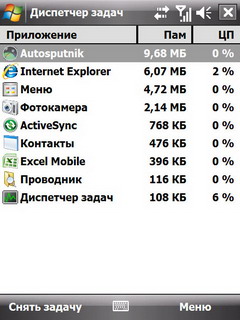 На мой взгляд, диспетчер очень неудобен - в том же HTC диспетчер сделан на порядок лучше, потому что позволяет одним щелчком убирать из памяти произвольные программы (там выводятся специальные пиктограммы), а здесь программу нужно сначала выделить, а потом уже щелкнуть по "Снять задачу".