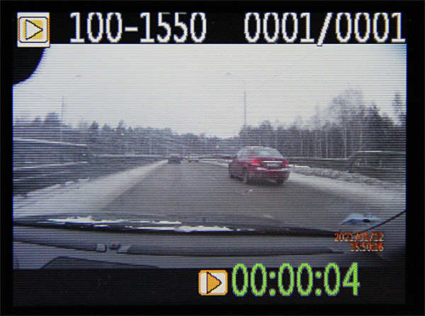 Для воспроизведения на видеорегистраторе записанных роликов нужно нажать кнопку Play. По умолчанию показываются первый кадр ролика и его параметры (номер, дата, размер). Перемещаться между роликами можно с помощью клавиш "Вверх" и "Вниз", а запускается ролик кнопкой "Menu / Ввод". Клавишами "Вверх" и "Вниз" во время воспроизведения можно запускать ускоренную прокрутку.
