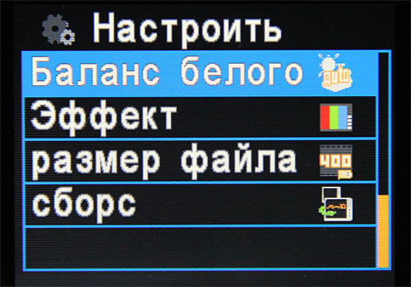 Баланс белого - ручная настройка баланса белого под различные условия (автомат, день, ночь, солнечно, облачно, помещение). Однако практика показала, что даже, например, ночью лучше выбирать автоматическое определение.