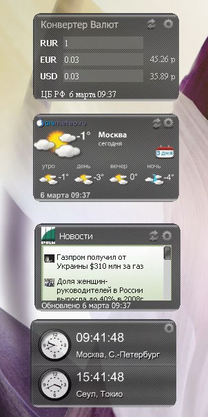 Виджеты, конечно, смотрятся неплохо, но какой-то ценности не представляют - для XP я предпочитаю Yahoo! Widgets или Google Desktop.