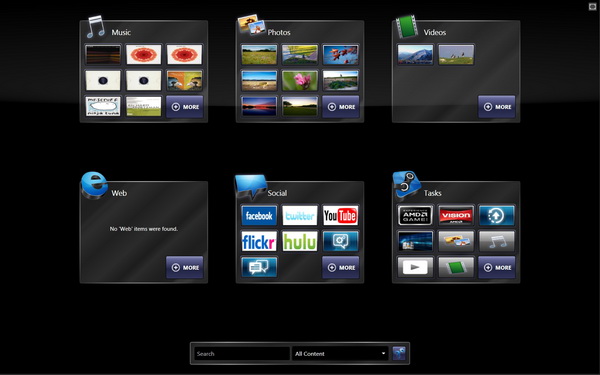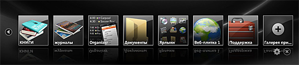 Сцена Dell представляет собой нечто вроде док-станции с крупными пиктограммами различных приложений - музыка, фото, видео, игры, книги, журналы и так далее.