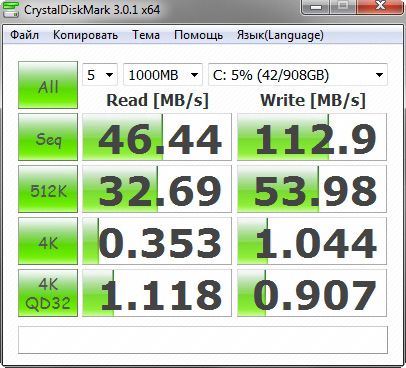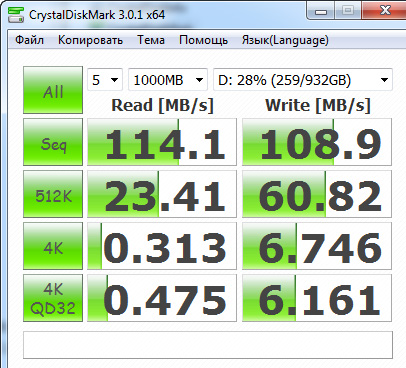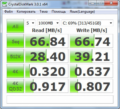 Погонял тесты на CrystalDiskMark. Вроде бы прилично, однако скорость чтения - явно низковата. Зато скорость записи очень неплохая.