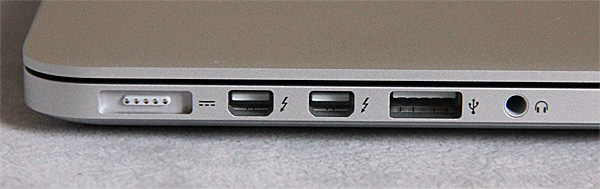 Левый торец - слот для подключения сетевого адаптера MagSafe2, два порта Thunderbolt, USB 3.0, выход для подключения наушников.