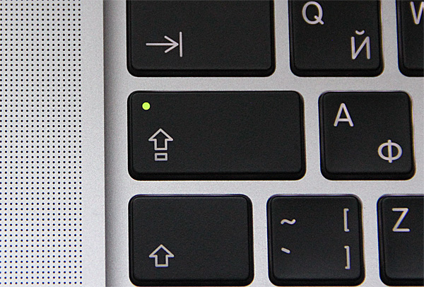 С индикаторами тут, как обычно для эпловских ноутбуков, все в порядке. То есть их нет как класса. Вам не нужны индикаторы, сказал дядя Джобс, царствие ему небесное, и тут их нет. Исключение сделано только для клавиши CapsLock - когда она нажимается, загорается крохотный светодиодик. Уж и не знаю, почему для этой клавиши было сделано исключение, возможно, это просто признаки коррупции в стройных рядах фирмы Apple.