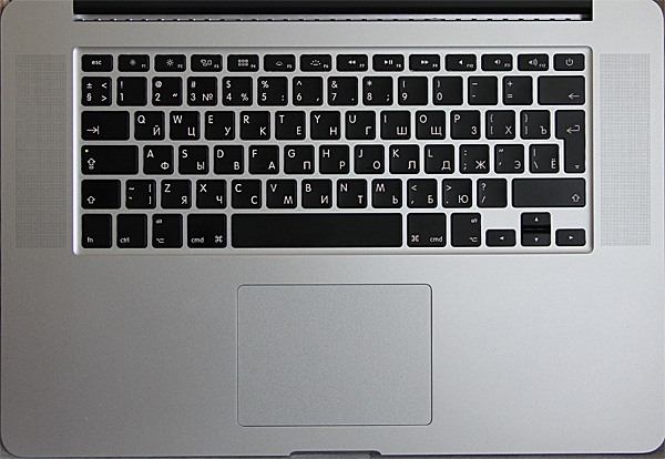 Верхняя часть корпуса выполнена в традиционном для MacBook Pro стиле - здоровенный тачпэд (105 × 76 мм), обычная маковская клавиатура и динамики слева и справа от клавиатуры.