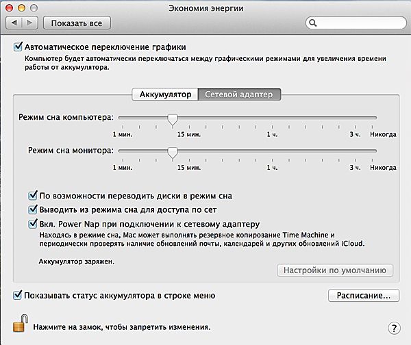 Интереснейшая возможность, позволяющая ноутбуку даже в режиме сна производить некие действия - резервное копирование (Time Machine), опрос почты, обновление календарей и прочих данных из iCloud.