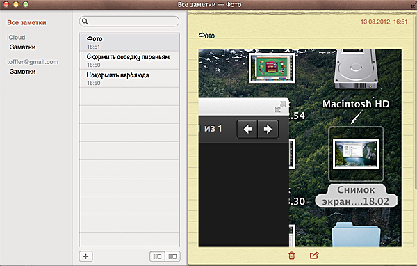 Простенькие одноуровневые заметки. Можно добавлять текст, делать снимки экрана или фото с камеры. Раньше заметки были частью программы Mail, сейчас их для совместимости вывели в отдельное приложение. Приложение совершенно примитивное, не очень понятно, зачем его использовать, особенно при наличии Evernote под все платформы.
