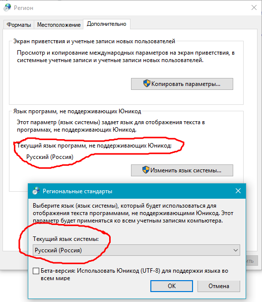Скриншот сделан в английской винде. Язык интерфейса переключен на русский. Язык системы (для приложений не поддерживающих Unicode) аналогично выставлен на русский.