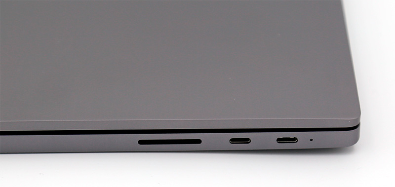 На правом торце - два порта Type-C, но для зарядки используется только первый, снабженный индикатором состояния. Также здесь расположен кардридер.